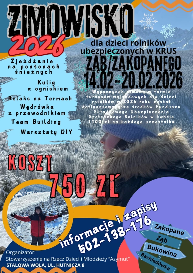 Stowarzyszenie na Rzecz Dzieci i Młodzieży Azymut Stalowa Wola serdecznie zaprasza dzieci rolników na zimowisko w malowniczej miejscowości Ząb – najwyżej położonej miejscowości w Polsce, położonej nieopodal Zakopanego.